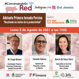 Adelanto de la Primera Jornada Porcina “Desafiando los límites de la productividad”Fecho del Evento: 01/08/2021 11:55hsEn día especial, el lunes 2 de agosto a las 19 hs. te esperamos en un nuevo Conversando en Red por el vivo de Instagram de Red AlimentariaVamos a conversar con tres de los protagonistas de la Primera Jornada Porcina “Desafiando los límites de la productividad” M.V Jorge Brunori, Coordinador Proyecto Estructural Producción y Sanidad Porcina (INTA): Actualidad y perspectivas del sector porcino.Facundo Cabrera, Ingeniero de Proyectos y Puesta en Marcha (FIMACO): Producción sustentable y Economía circular: Rendering en porcinos.Marcia De Souza Vieira, Especialista en Servicios Técnicos Latam - Aves y cerdos (JEFO): Proteasa y Xilanasa: herramientas esenciales en el contexto de la nutrición de precisión y mejora de la salud instestinal.Link para acceder a la entrevista: https://www.instagram.com/red_alimentaria/La Primera Jornada Porcina “Desafiando los límites de la productividad” se realizará el 6 de agosto en forma virtual. La participación es sin costo, con inscripción previa en https://forms.gle/sCzMW7QF4q48JbP97Compartir en FacebookCompartir en TwitterCompartír en Linkedin Eventos - Calendario