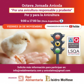 La Octava Jornada Av&iacute;cola est&aacute; dirigida a todos y cada uno de los actores de la avicultura, como los trabajadores de granjas, plantas de incubaci&oacute;n, de abuelas y reproductoras, de plantas de alimentos, distribuidores y toda la cadena comercial, los distintos proveedores de la actividad, docentes, alumnos, entre otros. &ldquo;Alineados con las Jornadas anteriores, entendemos que la avicultura tiene muchas responsabilidades y act&uacute;a prudentemente frente a tantos desaf&iacute;os que debe afrontar&rdquo;, dice el Dr. Isidro Molfese y detalla algunos de ellos: &ldquo;Primero y principal en el uso de antimicrobianos, evitando as&iacute; la posibilidad de ser parte de la cadena que est&aacute; creando un nivel de resistencia a los mismos, que preocupa seriamente. Como no se puede dejar de utilizarlos por la acci&oacute;n terap&eacute;utica en casos espec&iacute;ficos, la avicultura los usa en forma prudente, autorizados por la autoridad competente. Adem&aacute;s, trabaja por la seguridad alimentaria, con esfuerzo muy significativo, cuidando por la calidad de pollos y huevos; si bien son muchos los aspectos o atributos que hacen a la calidad, la avicultura presta atenci&oacute;n especial a la inocuidad de los productos mencionados y sus subproductos. Y podemos seguir mencionando muchos aspectos m&aacute;s como el cuidado del medio ambiente y las pr&aacute;cticas para el bienestar animal&rdquo;. El programa est&aacute; formado por los siguientes temas y disertantes: 9:30 a 10 hs.: &ldquo;Protocolo para la Gesti&oacute;n de Cad&aacute;veres Animales en SICPA&rdquo; - Disertante: Ing. Agr. Dra. Paola Campitelli (Patrocina: Universidad de C&oacute;rdoba)?? &nbsp; 10 a 10:45 hs.: &ldquo;Ventajas del uso de saponinas de origen vegetal en ponedoras y parrilleros&rdquo; - Disertante: MV Gerardo Roulet (Patrocina: BIOAROMAS) &nbsp; 11 a 11:45 hs.: &ldquo;&iquest;C&oacute;mo impactan las moscas en la producci&oacute;n pecuaria? Diagn&oacute;stico e implementaci&oacute;n de estrategias de manejo&rdquo; - Disertante: Ing. Agr. PhD. Hern&aacute;n Mart&iacute;n Funes (Patrocina: CHEMOT&Eacute;CNICA) &nbsp; 11:45 a 12:15 hs.: &ldquo;Micotoxinas: Responsable y prudente en su gesti&oacute;n&rdquo; - Disertante: Prof. Dr. Carlos Mallmann (Patrocina: AMLAN International) ? &nbsp; 12:15 a 13 hs.: &ldquo;Probi&oacute;ticos, m&aacute;s all&aacute; de la exclusi&oacute;n competitiva. C&oacute;mo ayudan a optimizar la salud intestinal&rdquo; - Disertante: Ing. Agr., MSc, MBA Sandra Bonaspetti (Patrocina: PHIBRO) &nbsp; 14 a 14:30 hs.: &ldquo;Planes de luz en Ponedoras Comerciales&rdquo; - Disertante: M.V. Leonardo Leiva (Patrocina: Hy Line - Cab. Avic. FELLER) &nbsp; 14:30 a 15:15 hs.: &ldquo;Caminos para la producci&oacute;n rentable de pollos naturales&rdquo; - Disertante: Ing. Agr. M&aacute;ximo Li&ntilde;eiro (Patrocina: NUPROXA) &nbsp; 15:15 a 15:30 hs.: &ldquo;Puntos a tener en cuenta al momento de usar medicamentos en la granja&rdquo; - Disertante MVZ William Corrales (Patrocina: BEDSON) &nbsp; 15:30 a 16 hs.: &ldquo;Uso de &Aacute;cidos Biliares en Producci&oacute;n Av&iacute;cola&rdquo; - Disertante: MV Miguel Penas (Patrocina: M. CASSAB &ndash; LANCHANCE) &nbsp; Durante el evento se realizar&aacute;n dos Mesas Redondas virtuales en las que los disertantes responder&aacute;n en vivo a las preguntas de los asistentes. La participaci&oacute;n es sin costo, con inscripci&oacute;n previa a trav&eacute;s del siguiente link: https://forms.gle/wvYnp3YWxptFjxXU8 La transmisi&oacute;n ser&aacute; online desde la plataforma en YouTube. Son Patrocinadores de la Octava Jornada Av&iacute;cola: Phibro, Nuproxa, BioAromas, BioIngenier&iacute;a, Amlan, Bedson, Chemotecnica, WVEPAH (World Veterinary Education in Production Animal Health), Hy Line, Caba&ntilde;a Av&iacute;cola Feller, MCassab y Lachance. La capacitaci&oacute;n cuenta con el AUSPICIO de: Universidad Nacional de C&oacute;rdoba, CEPA, GEA, Asociaci&oacute;n Argentina de Zoonosis, CAPROVE, G.T.A, WPSA -The World&acute;s Poultry Science Association-, AMEVEA Entre R&iacute;os, APASUR, FENAVI (Federaci&oacute;n Nacional de Avicultores de Colombia), ASERPHU (Asociaci&oacute;n Espa&ntilde;ola de Productores de Huevos), PROAVIH (Productoras Av&iacute;colas de Honduras), INPROHUEVOS Guatemala, Asociaci&oacute;n de Avicultores de Tehuac&aacute;n, SOCPA (Sociedad Cubana de Producci&oacute;n Av&iacute;cola), FEDAVIE (Federaci&oacute;n de Avicultores del Ecuador), Ministerio de Agricultura, Ganader&iacute;a y Pesca de la Naci&oacute;n Argentina, INTI, Tecno Fidta Conecta, GS1 Argentina, Asociaci&oacute;n Red Agroalimentaria, CACER, CALIBA, ALATI, Pro Ecuador, ADSE, CAME, IPSAL, Universidad del Noreste-Facultad de Ciencias Veterinarias, Universidad de Concepci&oacute;n del Uruguay Facultad de Ciencias Agrarias, Universidad Nacional de La Plata Facultad de Ciencias Veterinarias, Universidad Nacional de Luj&aacute;n, Universidad de Mar del Plata Facultad de Ciencias Agrarias, Universidad Lomas de Zamora Facultad de Ciencias Agrarias, Universidad de Belgrano Facultad de Agrarias. Son MEDIA PARTNER: Solo Aves y Porcinos, ENGORMIX, Ma&iacute;z y Soya, BM Editores, Avicultura Industrial. Los horarios de inicio ser&aacute;n seg&uacute;n su ubicaci&oacute;n: Argentina, Brasil y Uruguay: 9 AM Costa Rica, Guatemala, El Salvador y Honduras: 6 AM Colombia, Ecuador, Panam&aacute;, Per&uacute; y M&eacute;xico: 7 AM Bolivia, Chile, Rep&uacute;blica Dominicana, Paraguay y Venezuela: 8 AM Espa&ntilde;a: 2 PM Para m&aacute;s informaci&oacute;n: (+54911) 4076-3131 / (+54911) 4539-2595 o enviando un correo electr&oacute;nico a info@redalimentaria.com / avicolatina@gmail.com. <p style="text-align: center;">