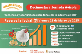 El ciclo 2025 de Jornadas de Capacitaci&oacute;n T&eacute;cnica abrir&aacute; el a&ntilde;o con la Decimoctava Jornada Av&iacute;cola &ldquo;Por y para la Avicultura&rdquo;, organizada en conjunto por Red Alimentaria y el Dr. Isidro Molfese, que se realizar&aacute; el pr&oacute;ximo 28 de marzo de manera virtual. En esta edici&oacute;n, el tema central ser&aacute;&nbsp;&quot;Tendencias y oportunidades para fortalecer la industria av&iacute;cola&quot;&nbsp;y estar&aacute; desarrollado desde distintas miradas por diez profesionales. El programa es el siguiente: 9:30 a 10 hs.: &quot;Problem&aacute;ticas asociadas a residuos de medicamentos en producci&oacute;n av&iacute;cola&quot; - Diserta: Dra. Mar&iacute;a Laura Moreno Torrej&oacute;n (Auspicia: FCV &ndash; UNICEN)&nbsp; &nbsp; 10 a 10:45 hs.: &quot;Construyendo programas de vacunaci&oacute;n y monitoreo serol&oacute;gico en reproductoras pesadas&quot;&nbsp;- Diserta: Dr. Jos&eacute; Juan Bruzual (Patrocina: AVIAGEN) &nbsp; 10:45 a 11:15 hs.:&nbsp;&quot;La iluminaci&oacute;n y su importancia en la producci&oacute;n Av&iacute;cola&quot; - Diserta: Ing Marcelo Chemello (Patrocina: Industrias Tecnol&oacute;gicas) &nbsp; 11 a 11:30 hs.: &quot;Innovaci&oacute;n, Eficiencia y Control Online en soluciones de digitalizaci&oacute;n integrales de ERP&quot;&nbsp;- Diserta: Ing. Eric Delsams Sauret&nbsp; (Patrocina: CSB-SYSTEM) &nbsp; 11:30 a 12 hs: &quot;&Aacute;cidos org&aacute;nicos y enriquecimiento intestinal&quot;&nbsp;- Diserta: Marli Arena Dionizio, DSc. (Patrocina: PERSTORP) &nbsp; 12 a 12:30 hs.: &quot;Estr&eacute;s oxidativo: el enemigo oculto de la producci&oacute;n animal&quot; - Diserta: Dra. Elizabeth Sant&iacute;n (Patrocina: SILVATEAM) &nbsp; 12:30 a 13 hs.: &quot;Antimicrobianos naturales e id&eacute;ntico-naturales en la industria veterinaria&quot; - Diserta: Prof. Ing. Carlos Rodr&iacute;guez (Patrocina: BEDSON) &nbsp; 13 a 13:30 hs.: &quot;La incubaci&oacute;n y su relaci&oacute;n con la calidad del pollo&quot; - Diserta: M.V. Cristiano Emanuelli Pereira MSc (Patrocina: COBB) &nbsp; 13:30 a 14 hs.: &quot;Beneficios del uso de saponinas triterp&eacute;nicas en pollos de engorde&quot; - Diserta: Prof. Dr. Tiago Goulart Petrolli (Patrocina: BIOAROMAS)&nbsp; &nbsp; 14 a 14:30 hs.: &quot;Optimizando el desempe&ntilde;o mediante enfoques fundamentados cient&iacute;ficamente para mitigar toxinas y el manejo de la salud intestinal&quot; - Diserta: C&eacute;sar Coto PhD. (Patrocina: AMLAN International) &nbsp; 14:30 a 15 hs.: &quot;Linaje GI-23 del virus de la Bronquitis Infecciosa. La experiencia brasile&ntilde;a&quot; - Diserta: MV Jos&eacute; Dias (Patrocina: PHIBRO A.H.)&nbsp; &nbsp; 15 a 15:30 hs.: Mesa redonda y cierre de la Decimoctava Jornada Av&iacute;cola &nbsp; La jornada se transmitir&aacute; en modalidad virtual a partir de las 9 hs (horario Argentina) y podr&aacute; verse tambi&eacute;n en otros pa&iacute;ses teniendo en cuenta el huso horario correspondiente: 5:45 hs Costa Rica, El Salvador, Guatemala, Honduras, Nicaragua, M&eacute;xico 6:45 hs Colombia, Ecuador, Panam&aacute;, Per&uacute; 7:45 hs Bolivia, Paraguay, Rep&uacute;blica Dominicana,Venezuela 8:45 hs Brasil, Chile, Uruguay 13:45 hs Espa&ntilde;a La actividad no es arancelada pero requiere de inscripci&oacute;n previa a trav&eacute;s de este link:&nbsp;https://cutt.ly/he51haQI&nbsp;Las personas que participen recibir&aacute;n un certificado de asistencia.&nbsp; <p style="text-align:center"> M&aacute;s informaci&oacute;n:&nbsp;info@redalimentaria.com,&nbsp;avicolatina@gmail.com